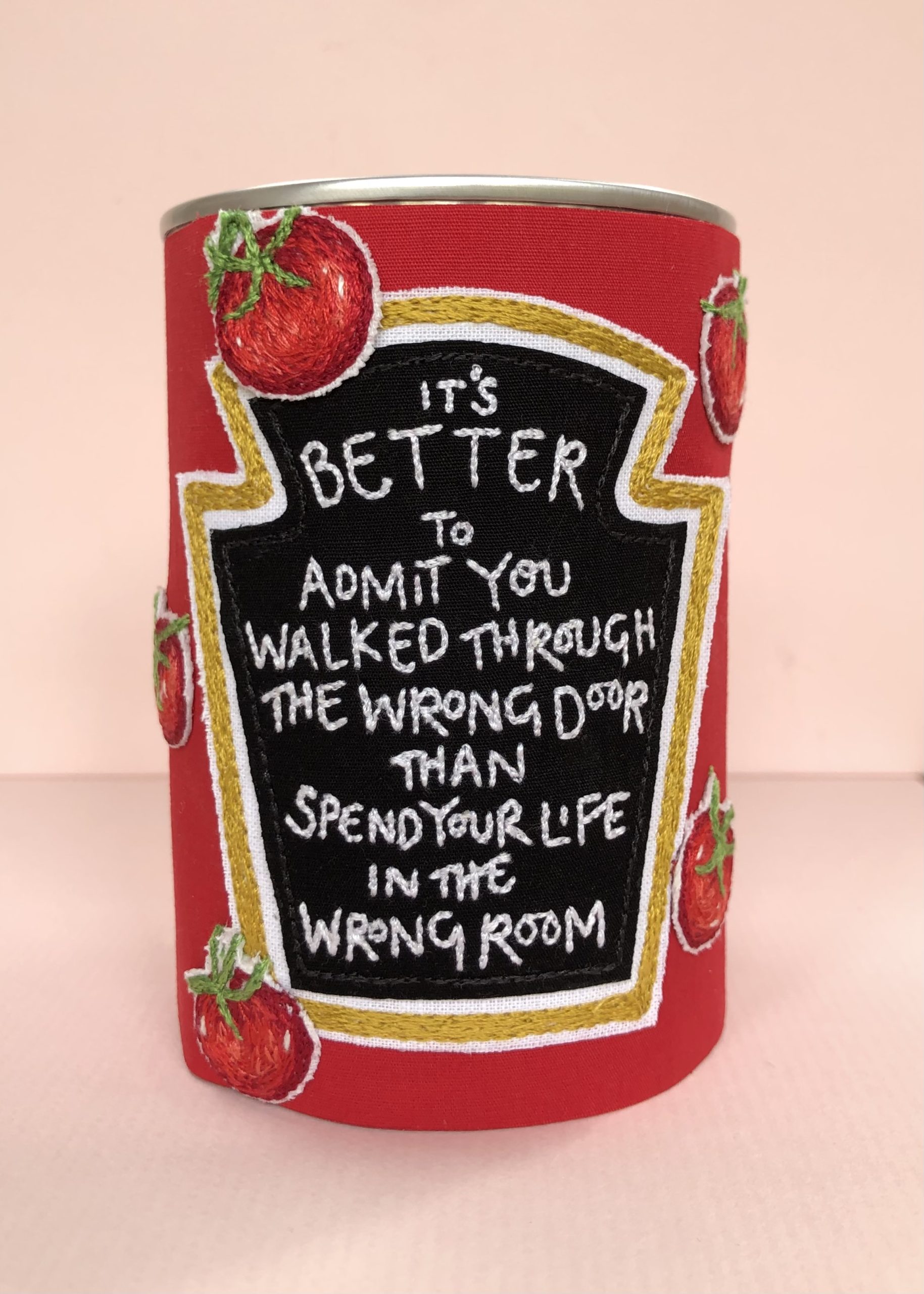 This original embroidered 3D piece captures the iconic tomato soup tin design with vibrant threadwork, while delivering a message of empowerment that is sure to deliver a hug in a tin