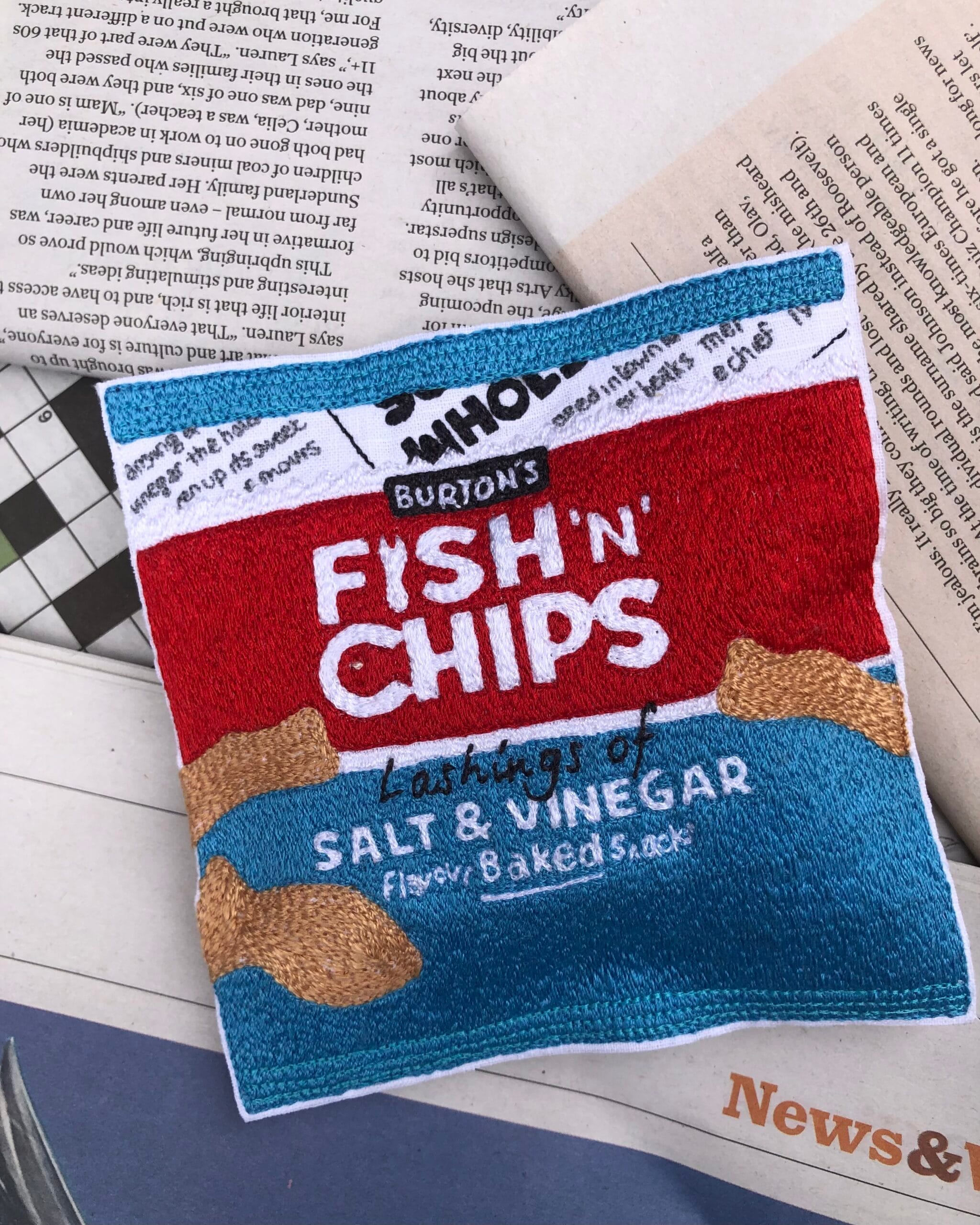 Each stitch captures the charm of the classic Burton’s Fish and chips crisp bag – a playful tribute to a favourite retro treat