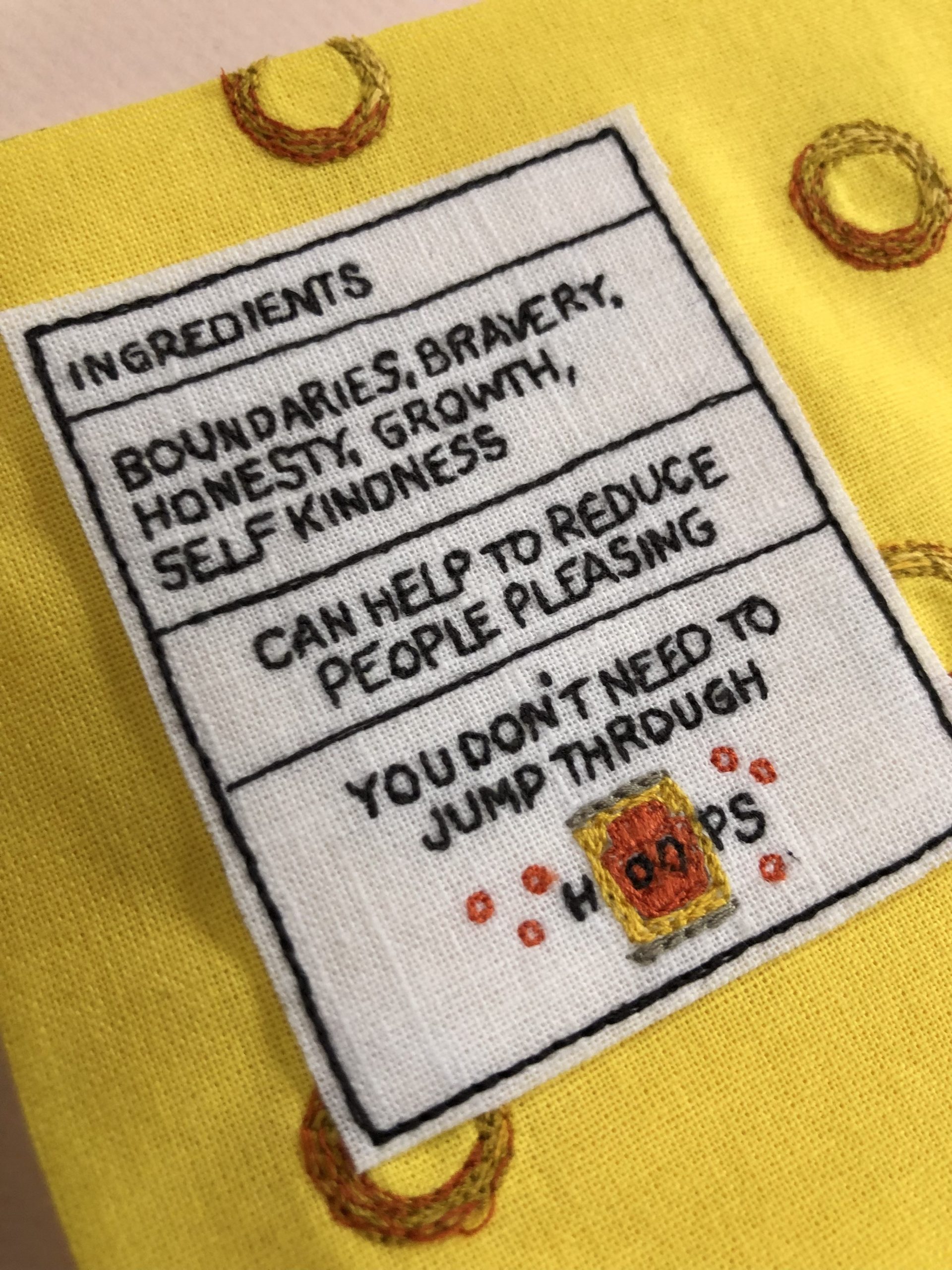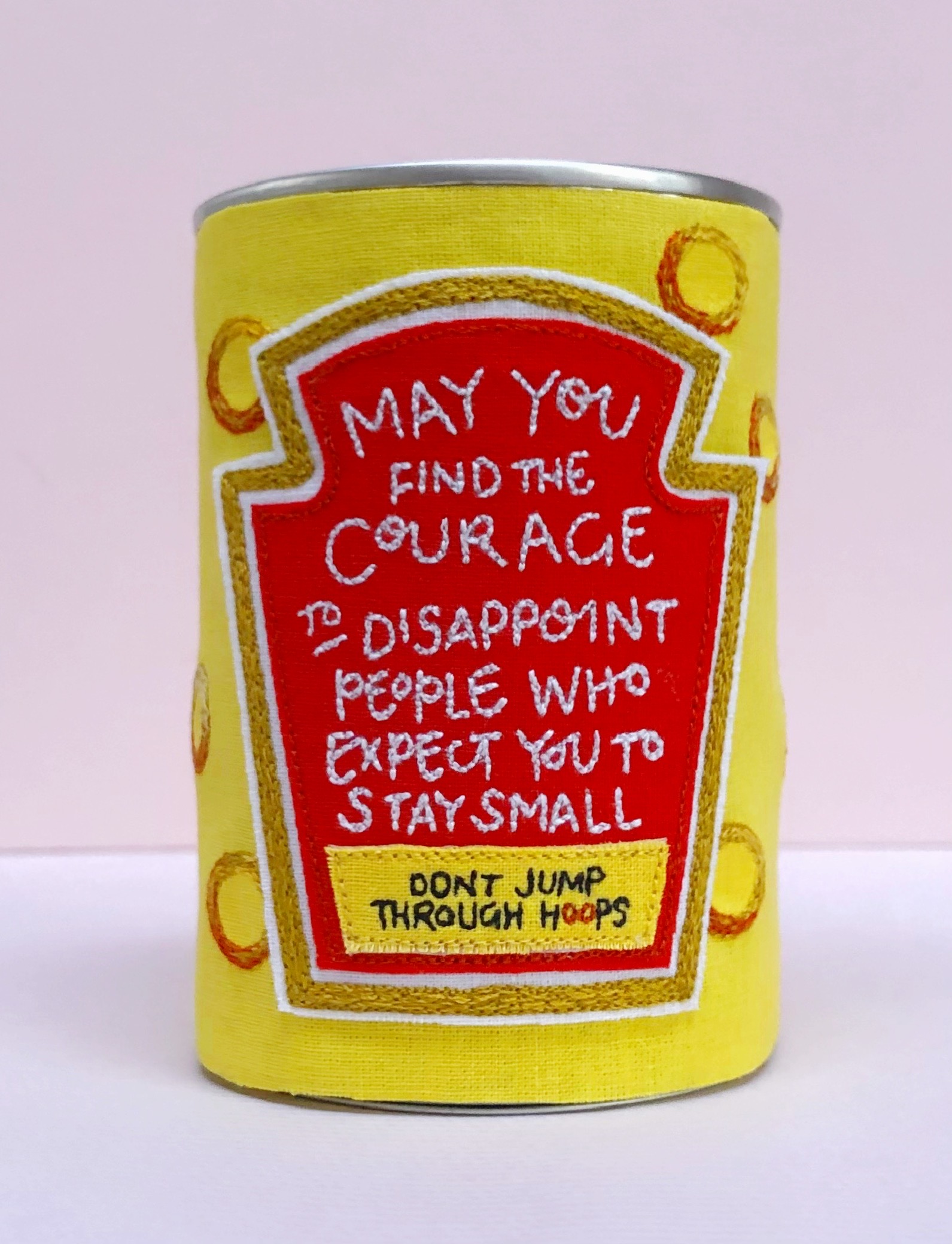 This original embroidered 3D piece captures the iconic spaghetti hoop tin with vibrant threadwork, while delivering a message of empowerment