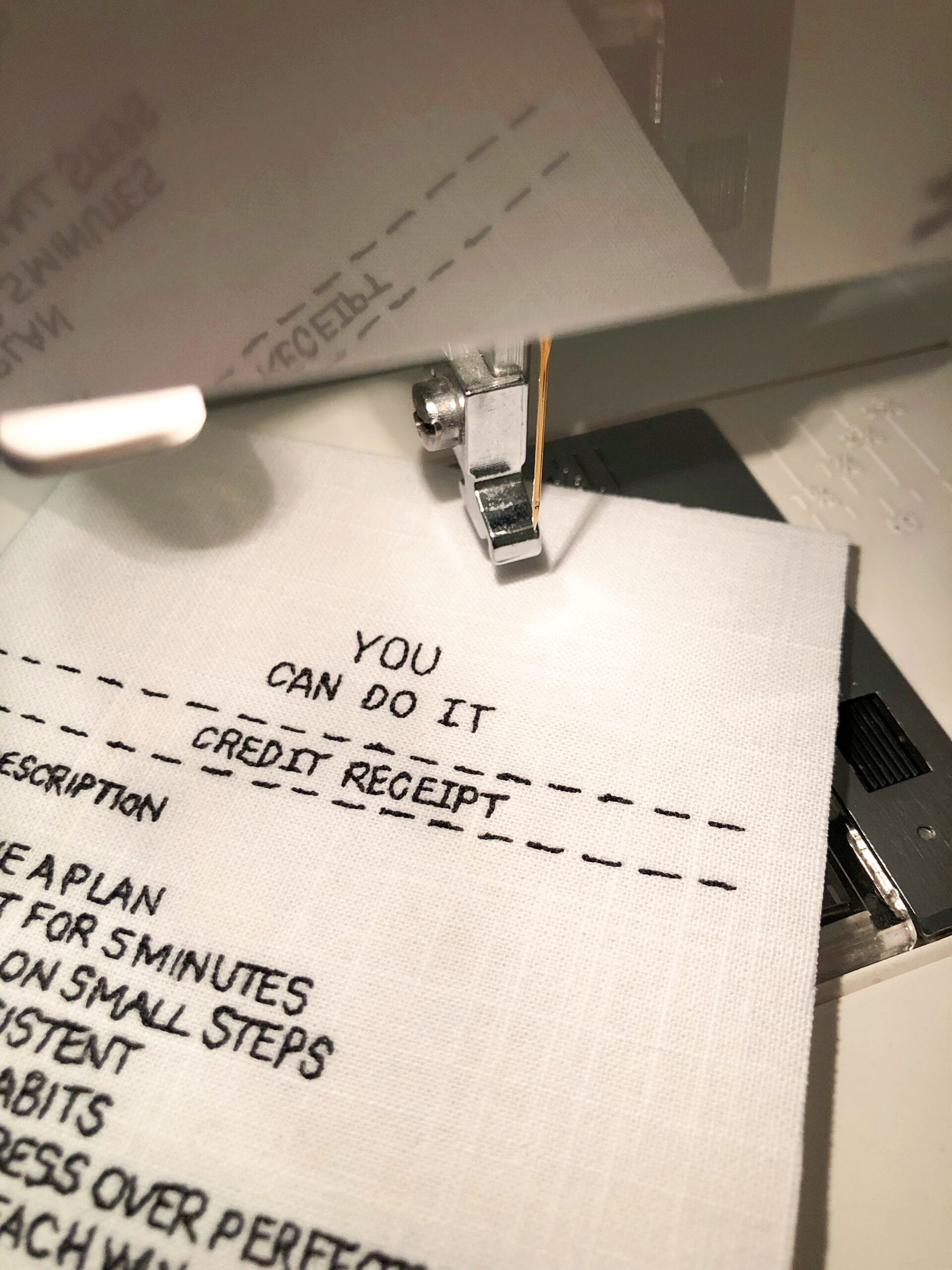The design, based on a receipt format, is carefully recreated on fabric using quality threads and thoughtful craftsmanship.