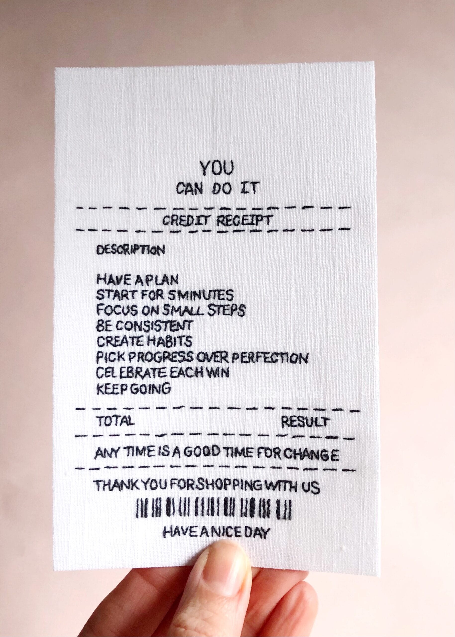 A playful twist on the everyday, this one-of-a-kind embroidered artwork transforms a simple shop receipt into a helpful prompt to guide new habits. Designed and delicately stitched by Emma Giacalone, this piece encourages you to give yourself credit for your efforts, and serves as a daily reminder that change can happen at any time.