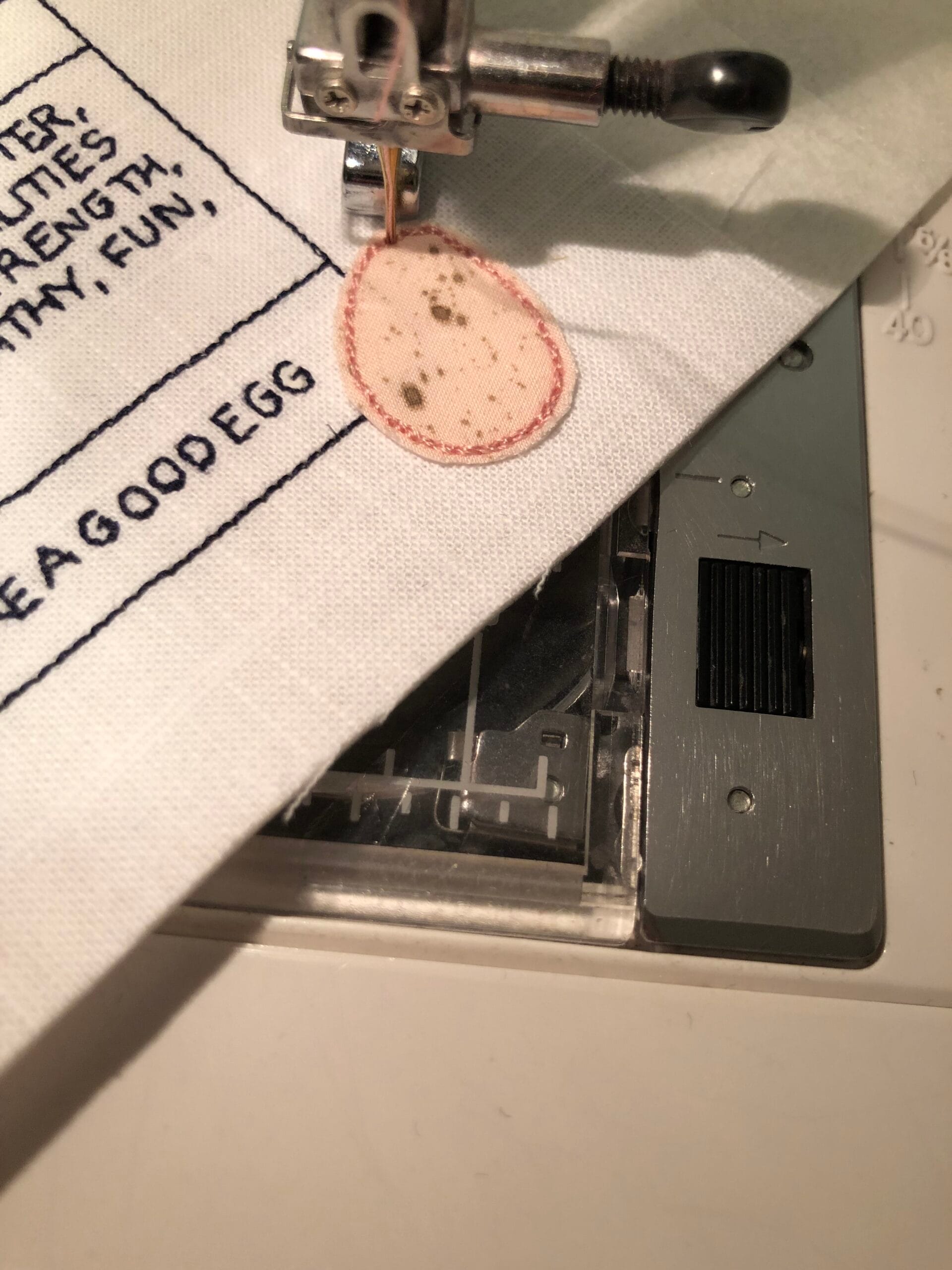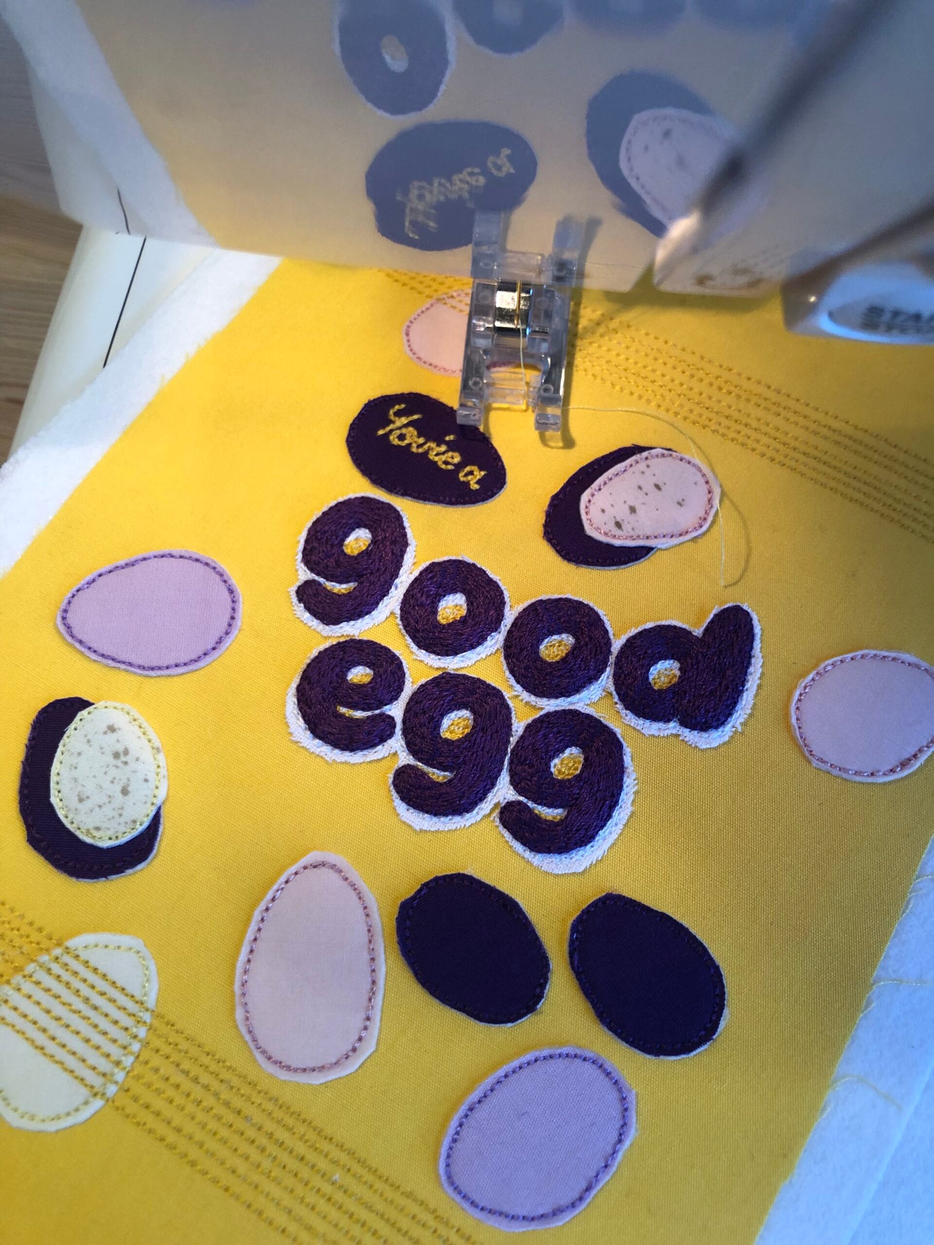 - Freehand machined embroidered onto 100% cotton, using Egyptian cotton thread, and wool felt backing