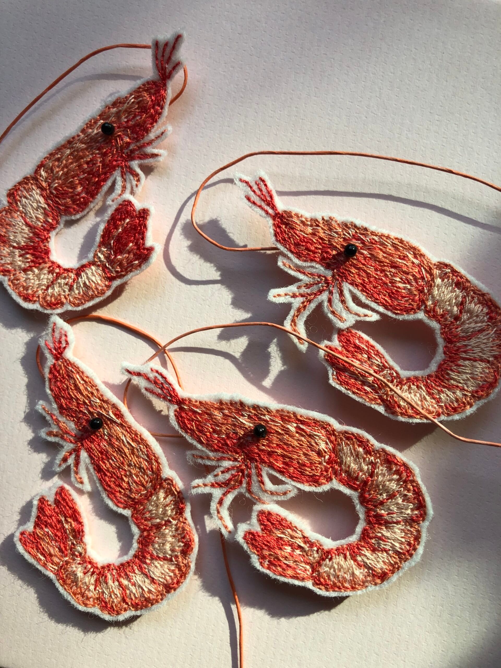 This original freehand machine embroidered prawn artwork is imagined and embroidered by Emma.